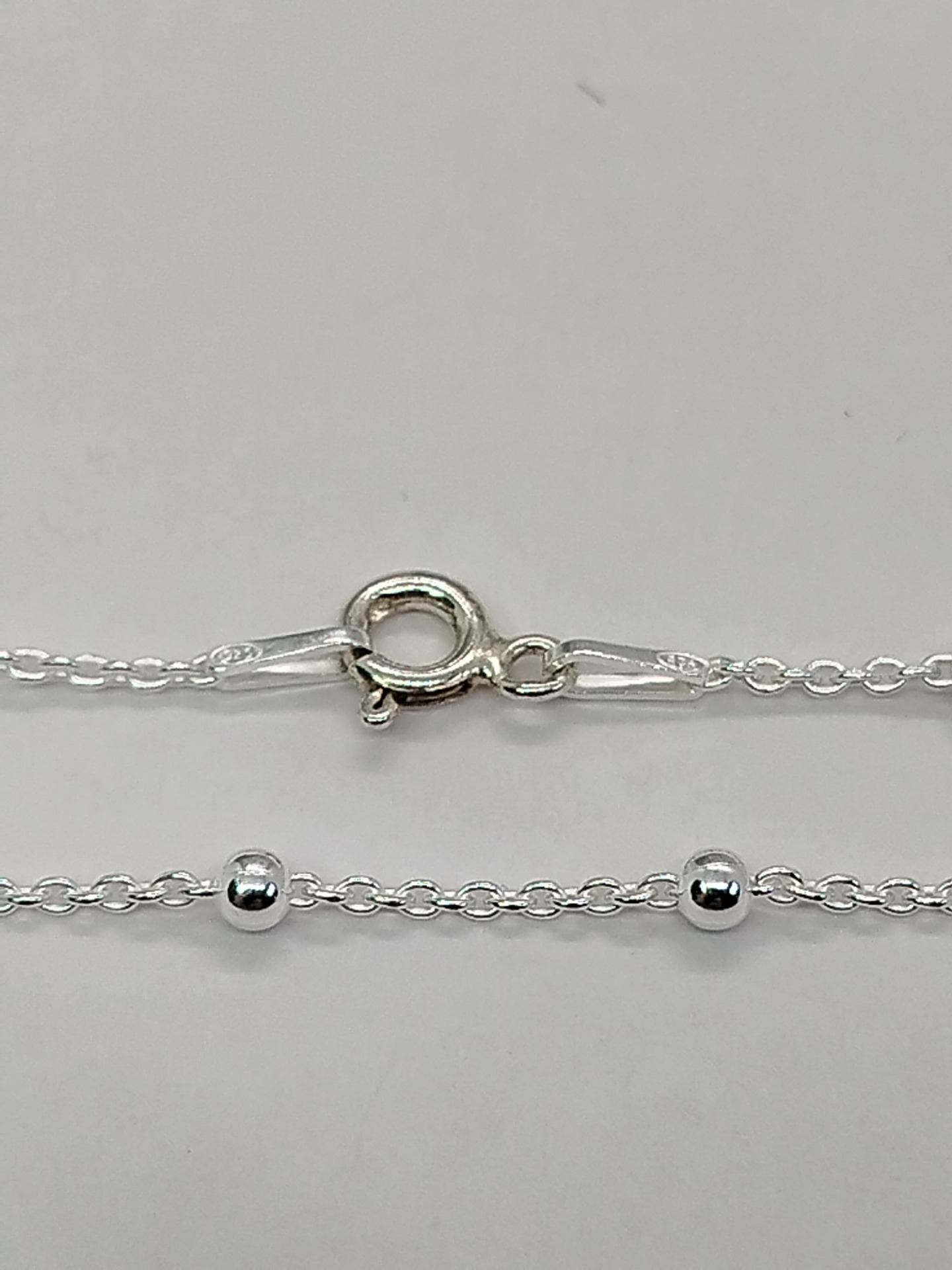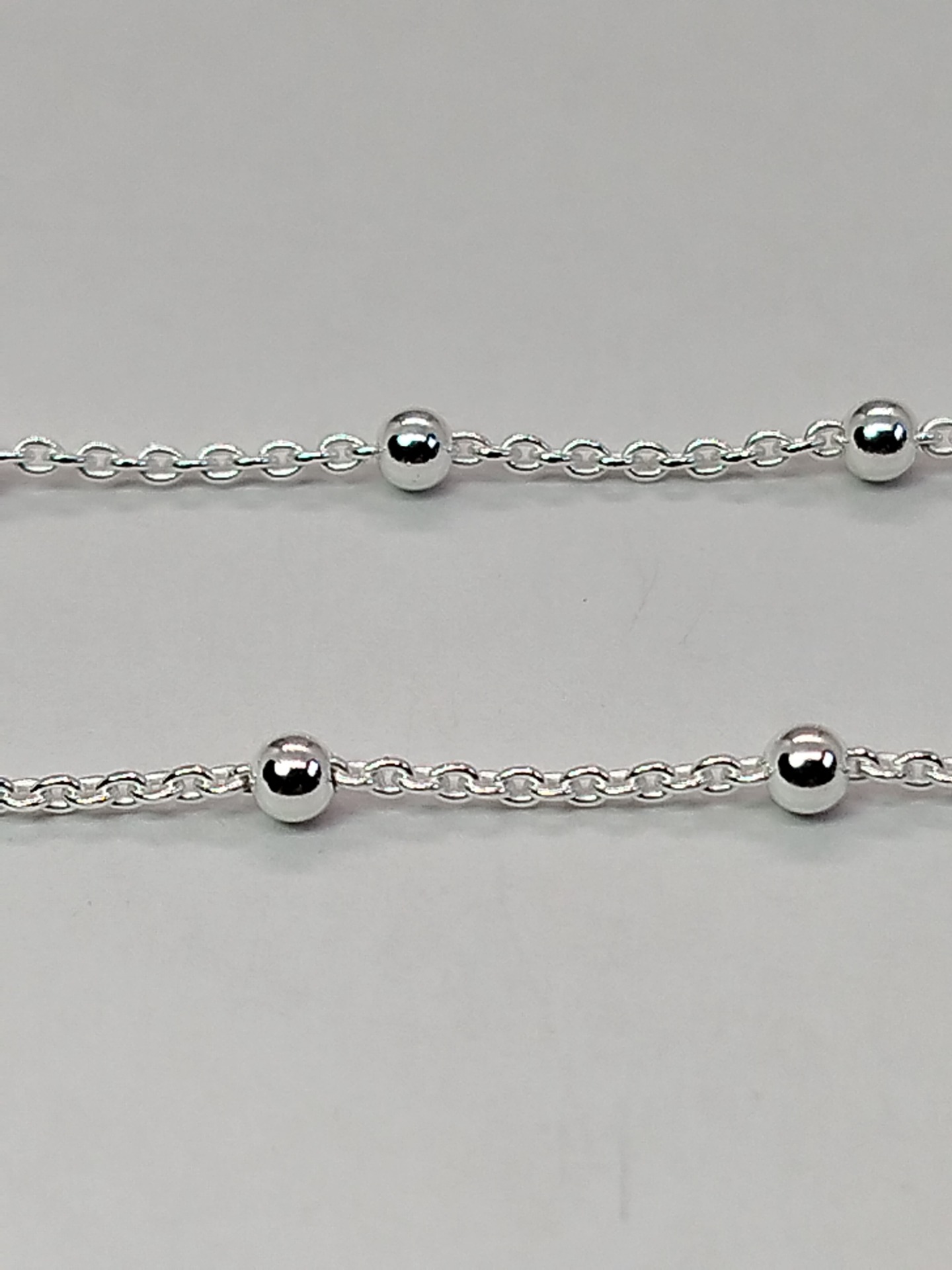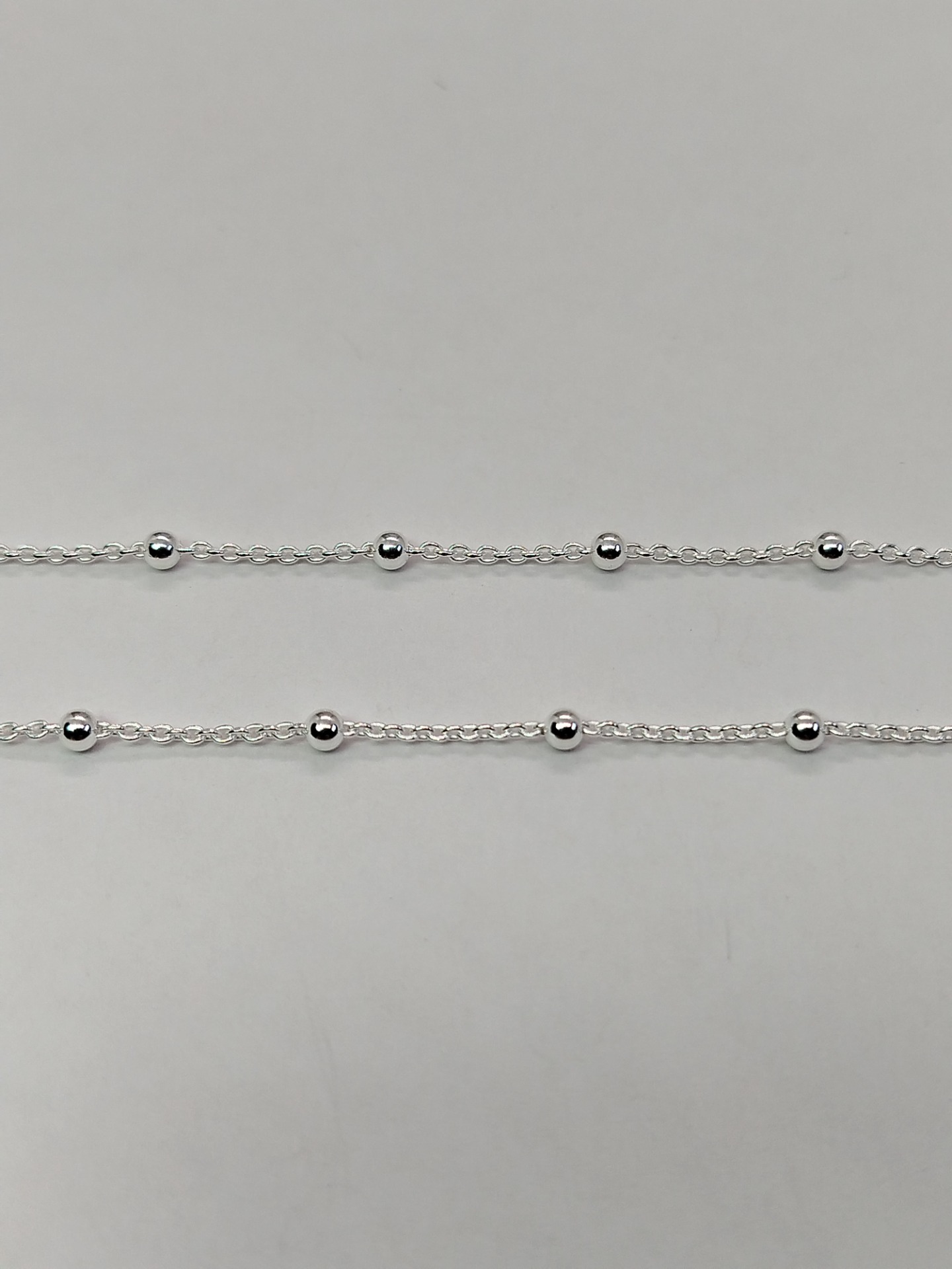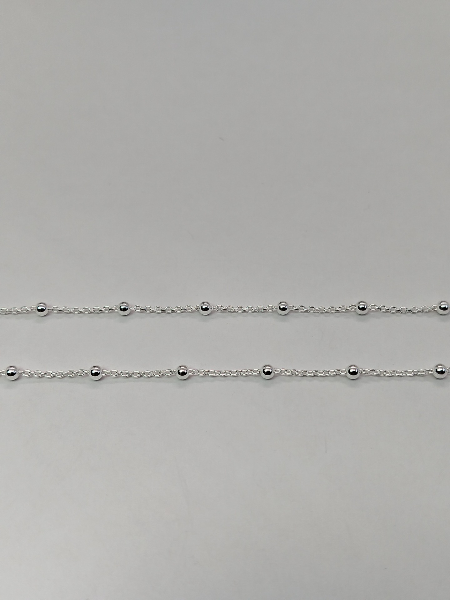 Cadena modeló Rolo Oval mide 50 cm de largo y 1.5mm de ancho.Bolas miden 2.5mm de diámetro.