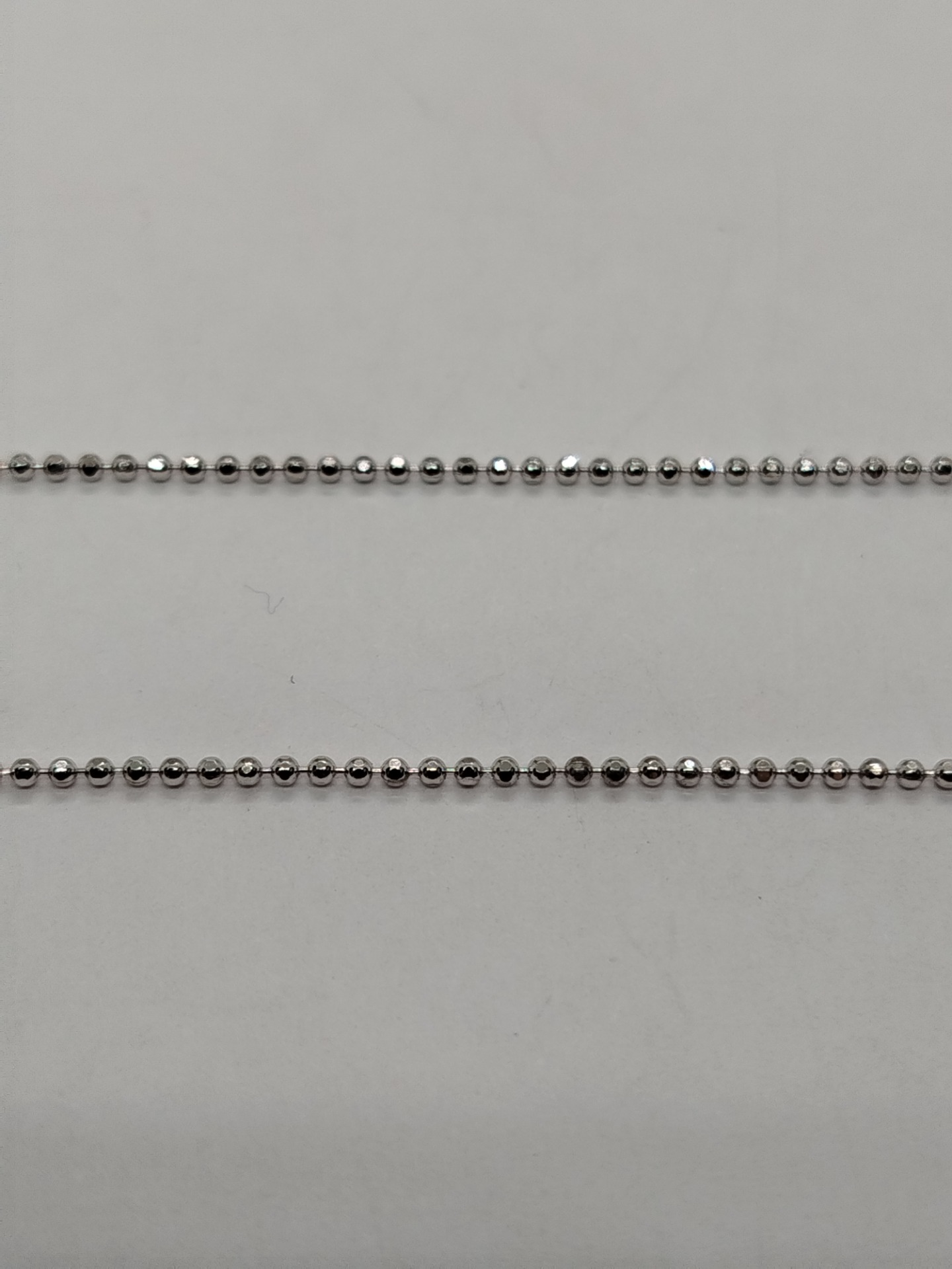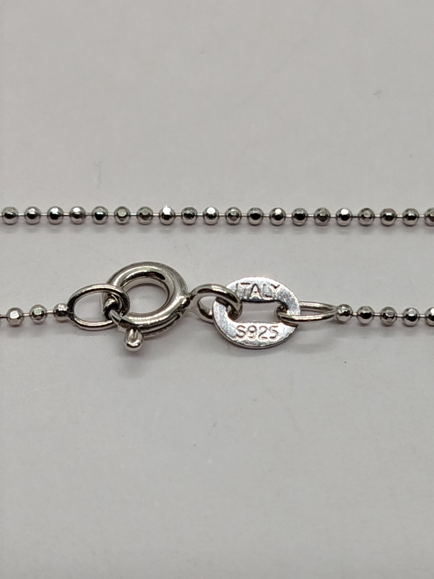 Plata auténtica, rodiada.Medida cadena de 45 cm de largo y las bolitas miden 1mm de diámetro,bolitas modelo diamante Con caja