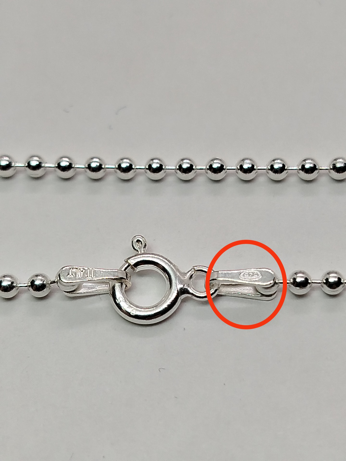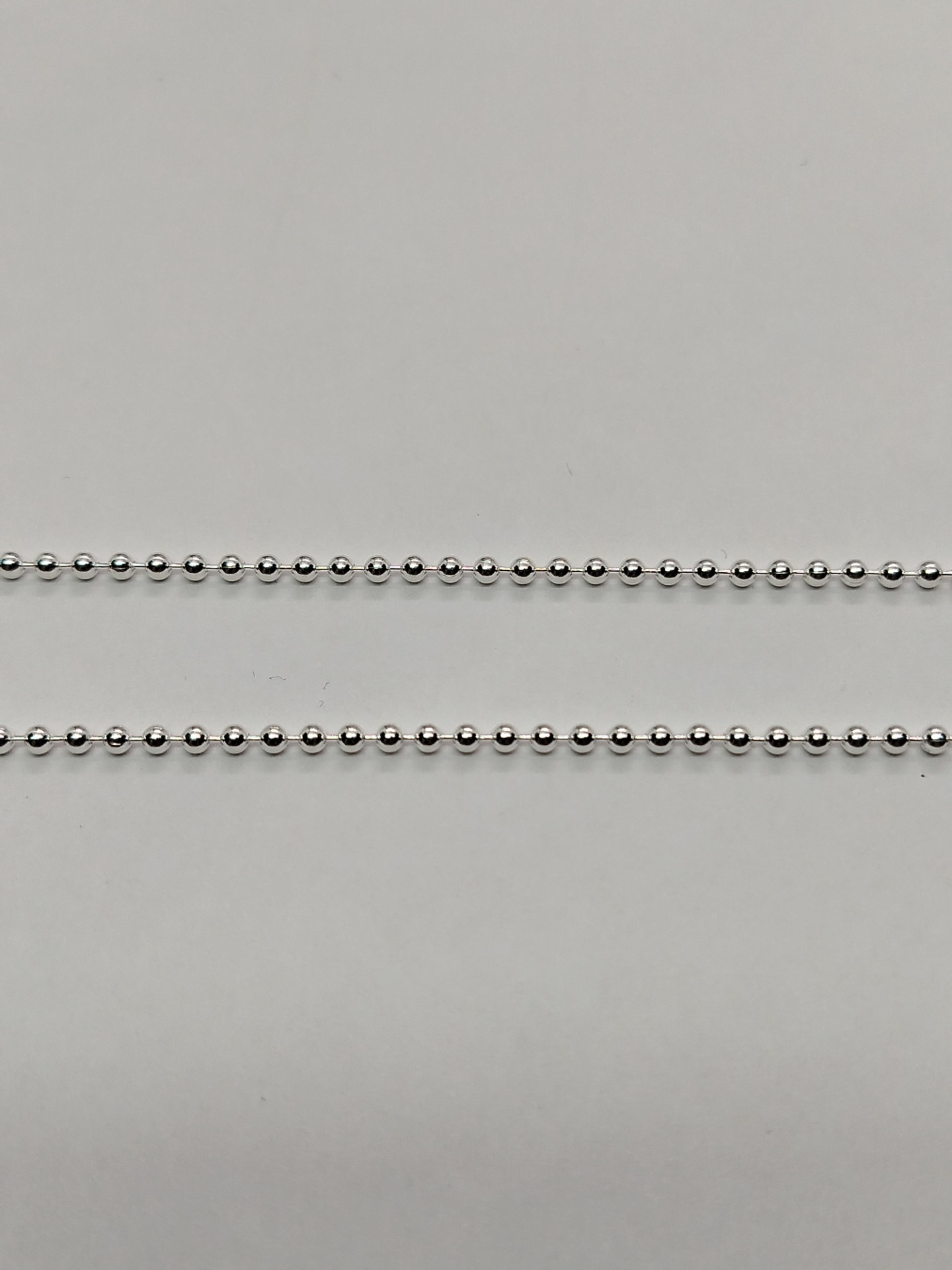 Longitud de la cadena de 49.5 cm.Bolas miden 1.8mm de diámetro.