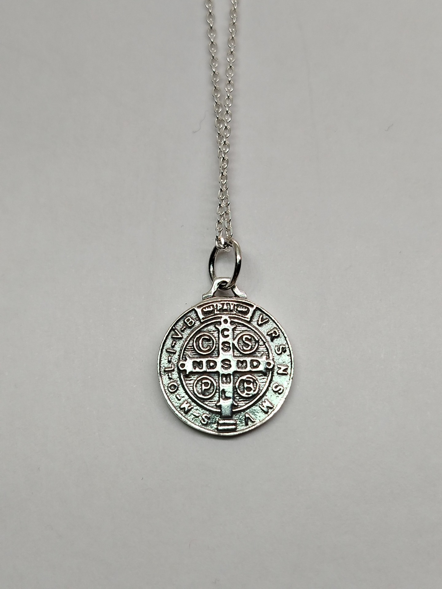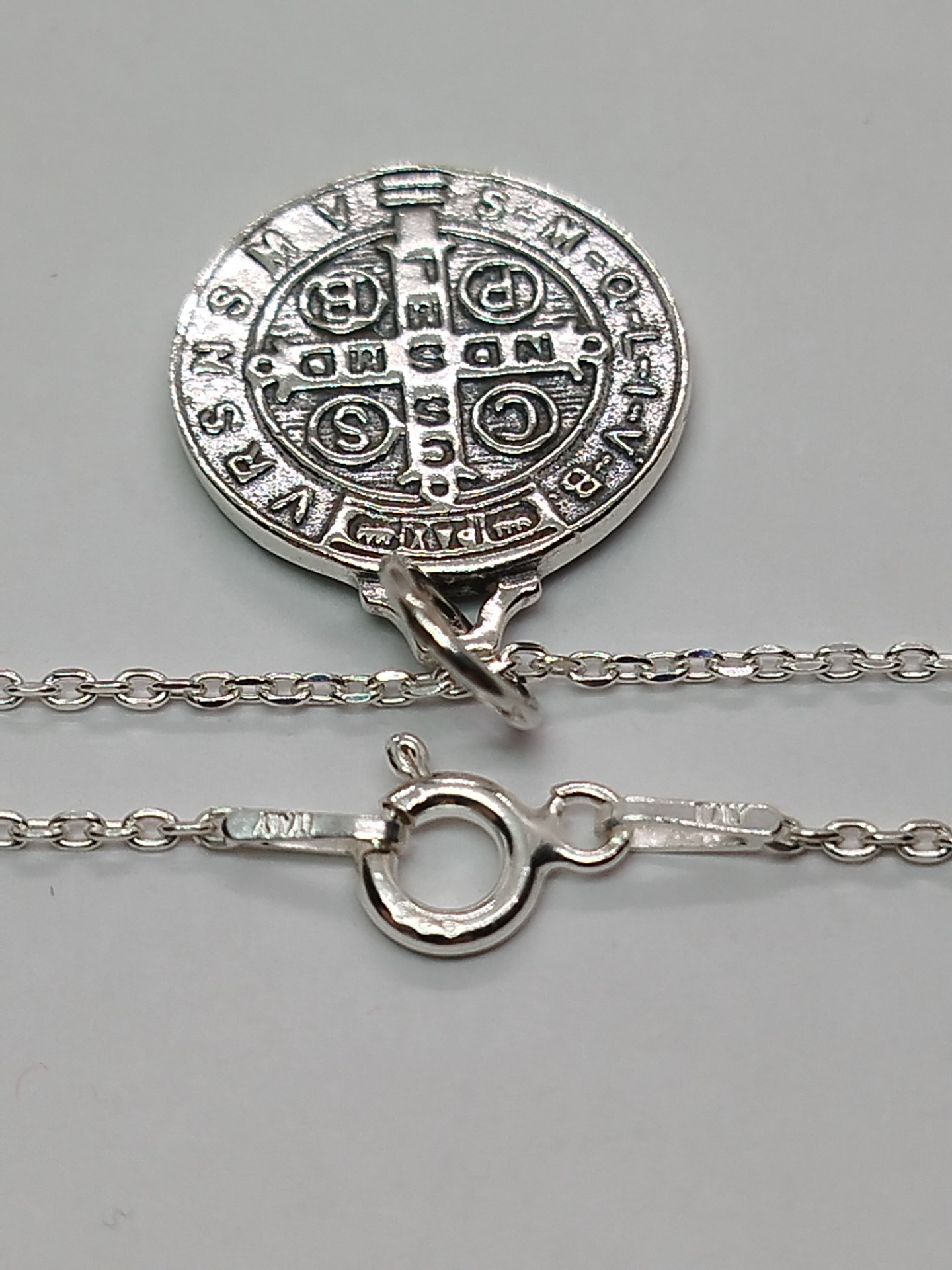 Medalla San Benito mide 1.6 cm . Y de grueso 1.5mm. plata auténtica.Con caja
