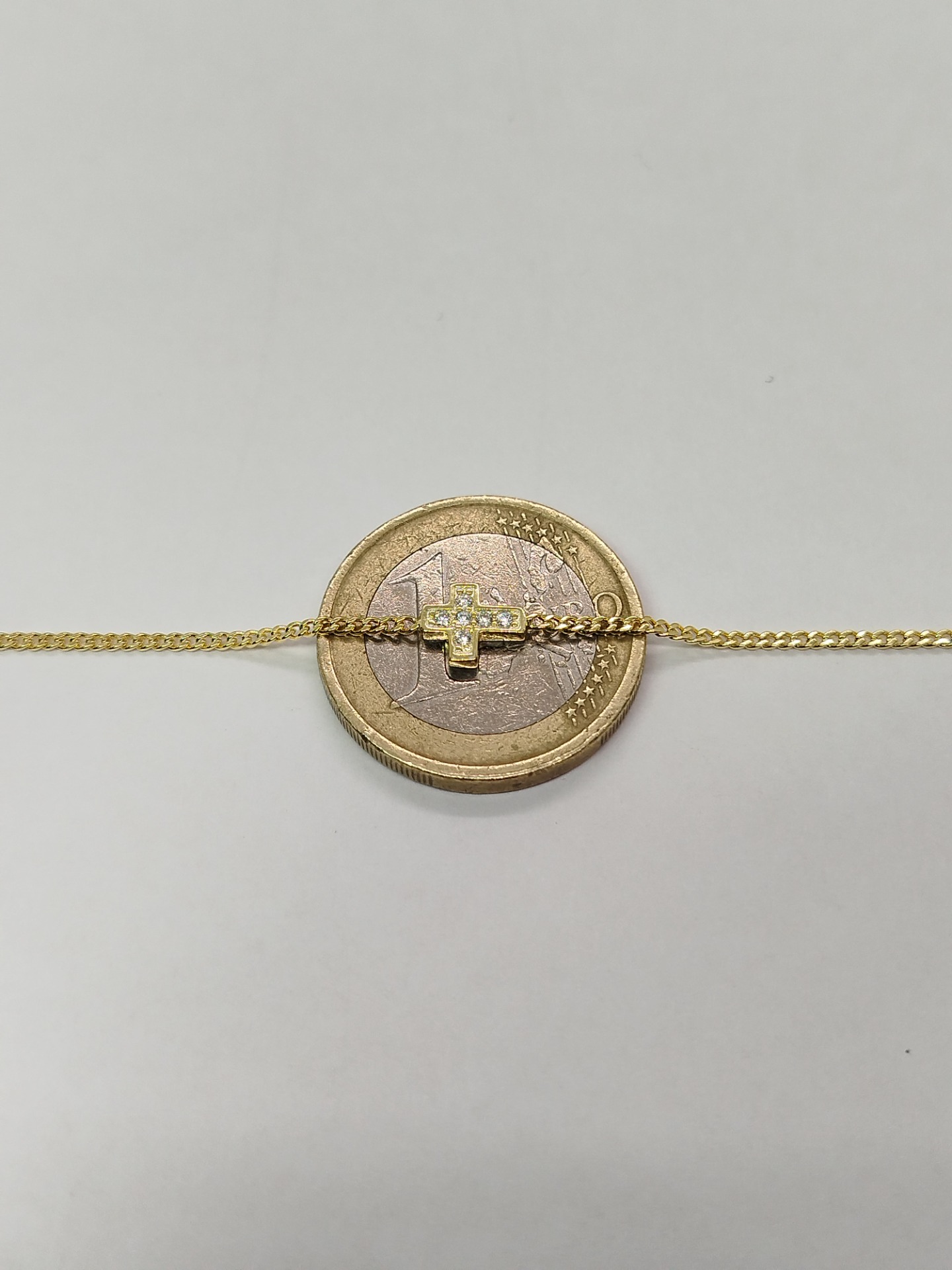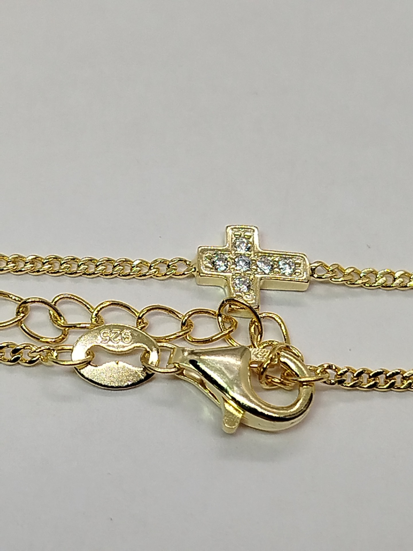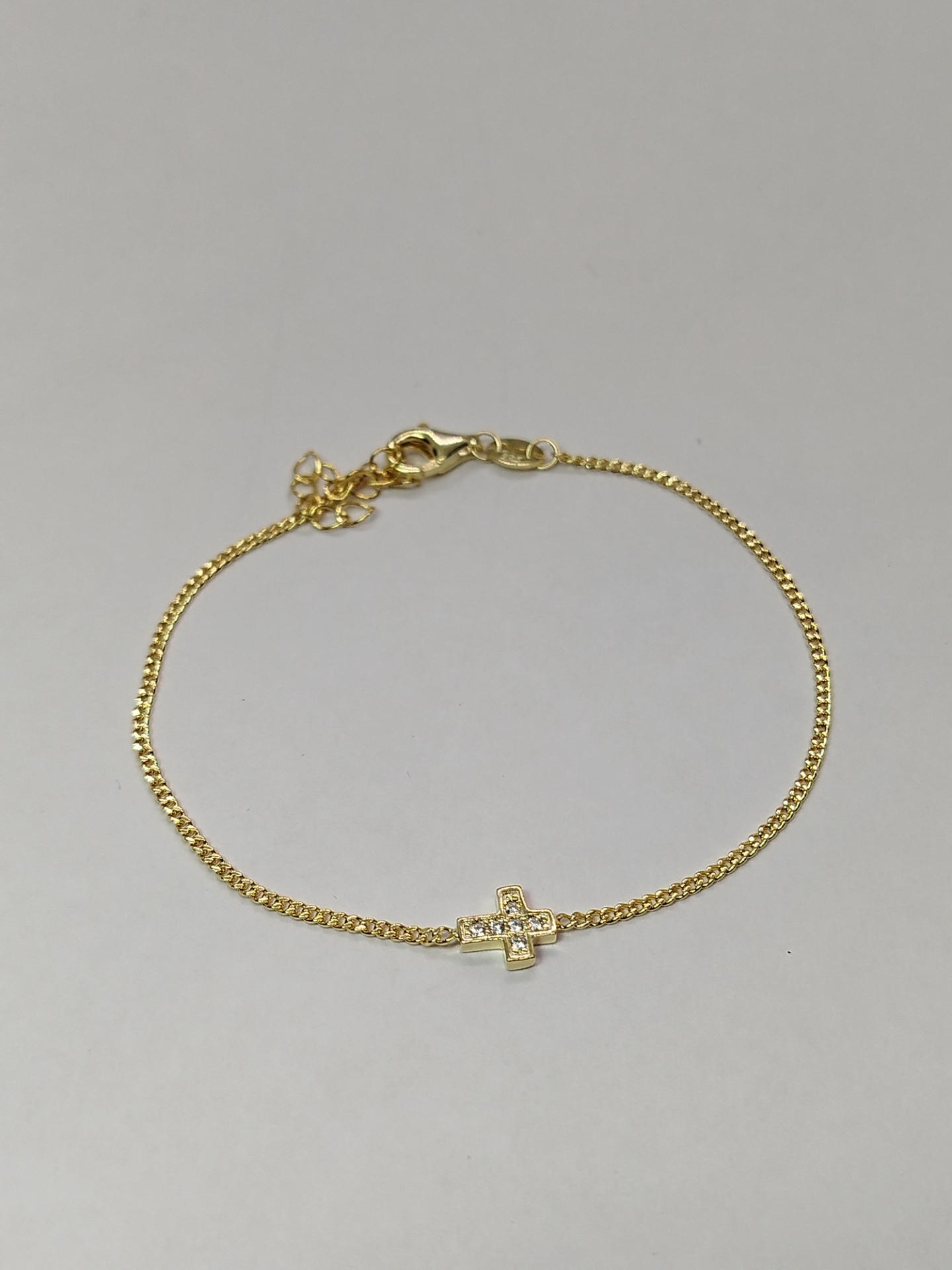 Mide pulsera 17 cm de largo con 3 cm de alargue y 1.5mm de ancho.Cruz mide 0.7x0.5mm y tiene piedras zirconitas color blanco.